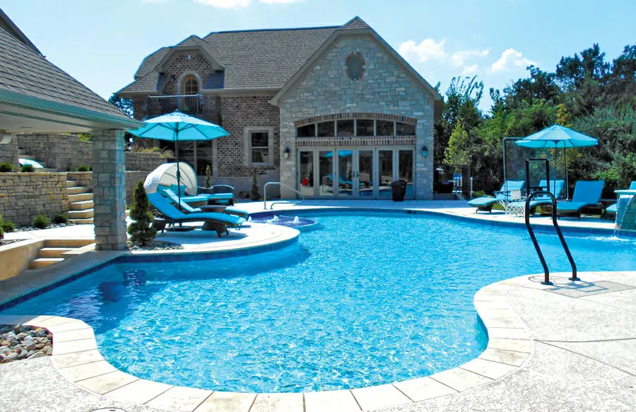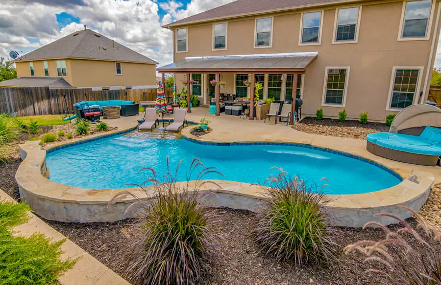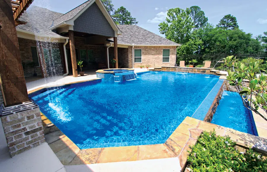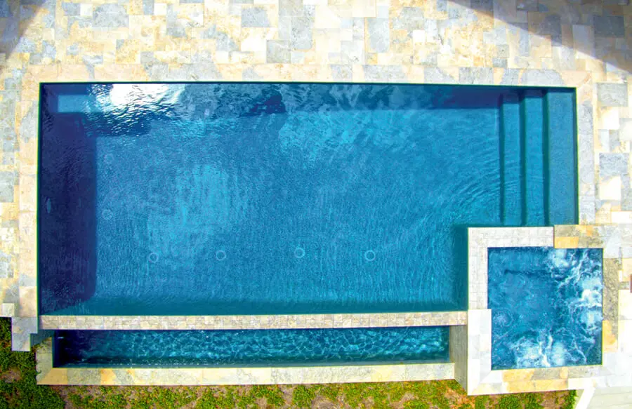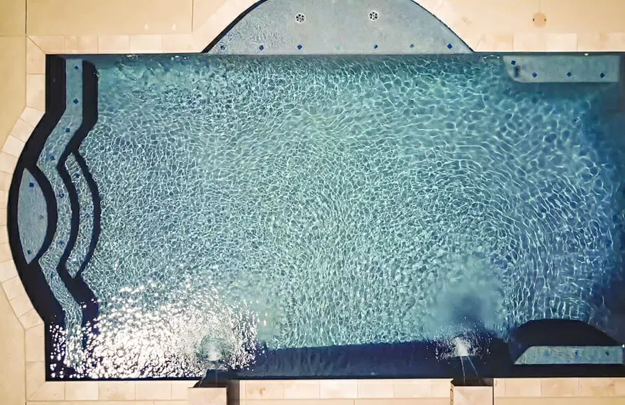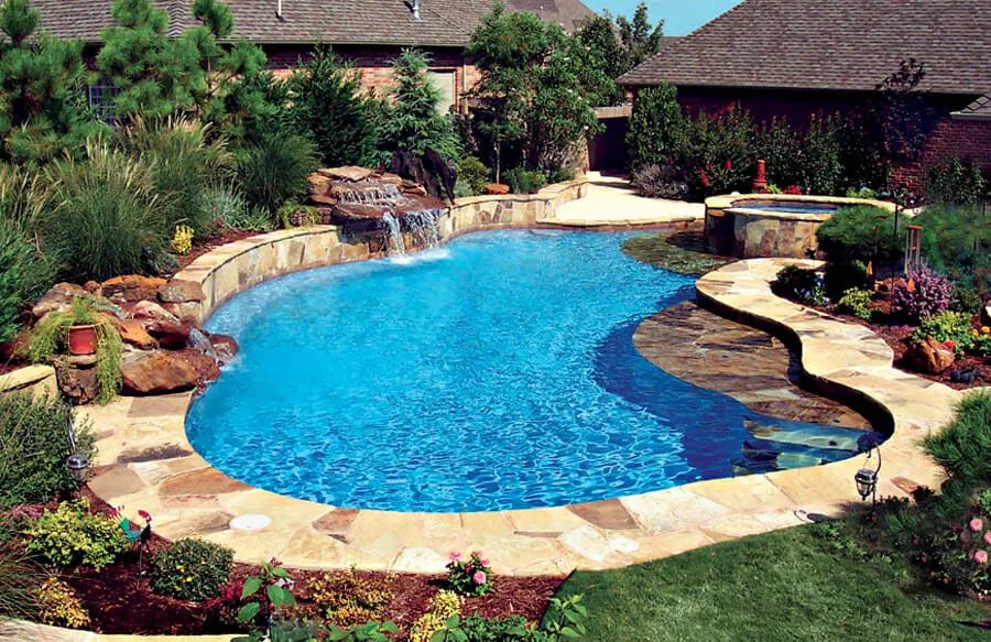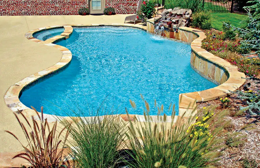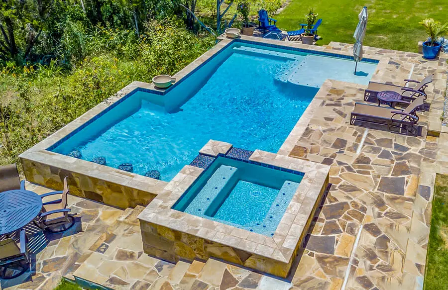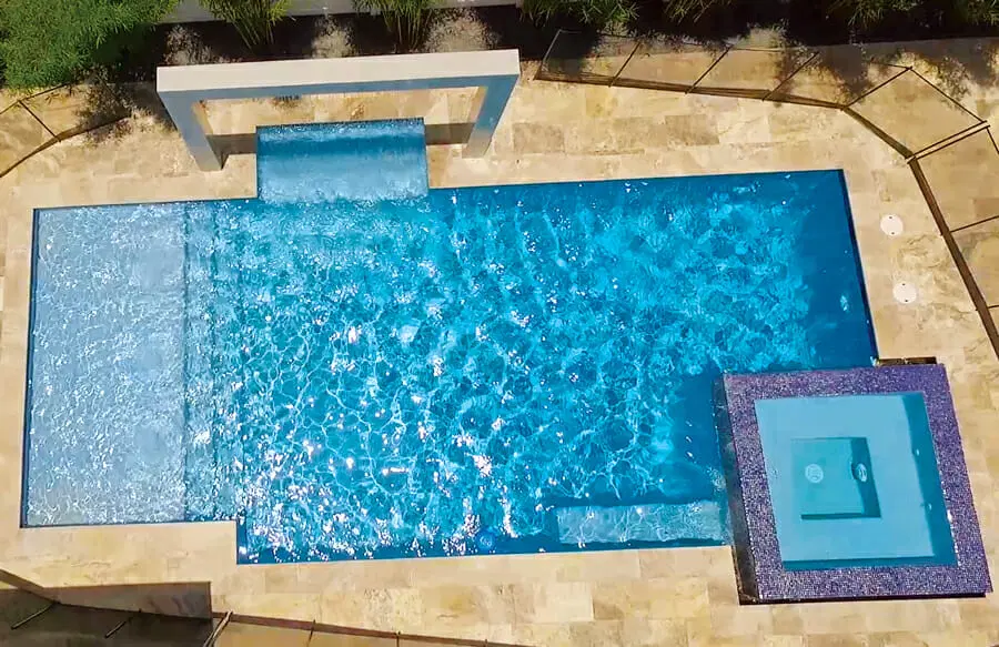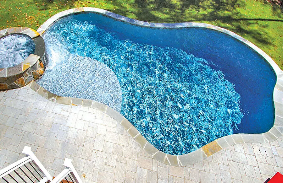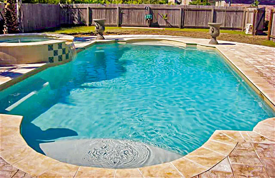 Curvy pool and spa wirh tanning shelf and sparkling teal water.