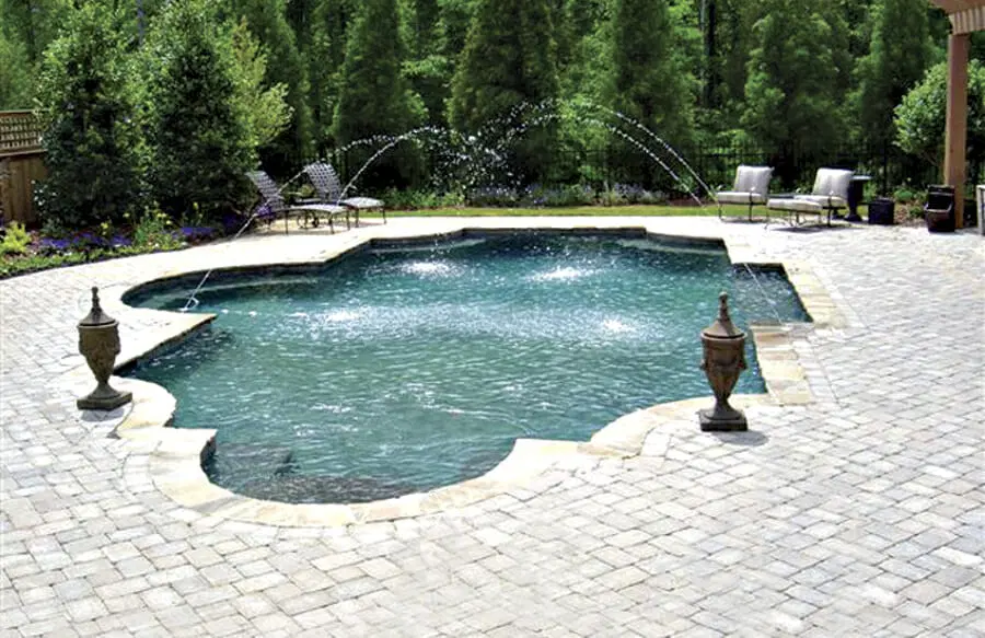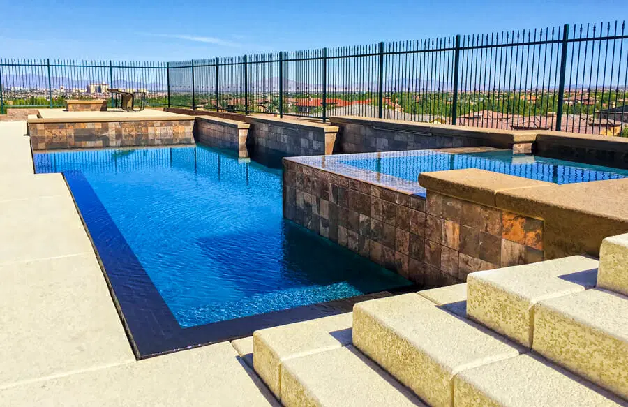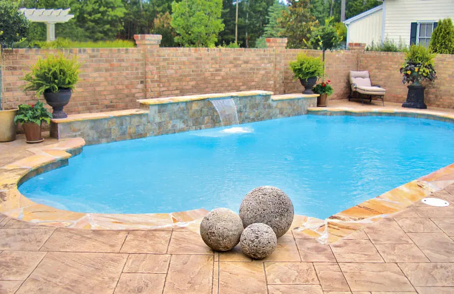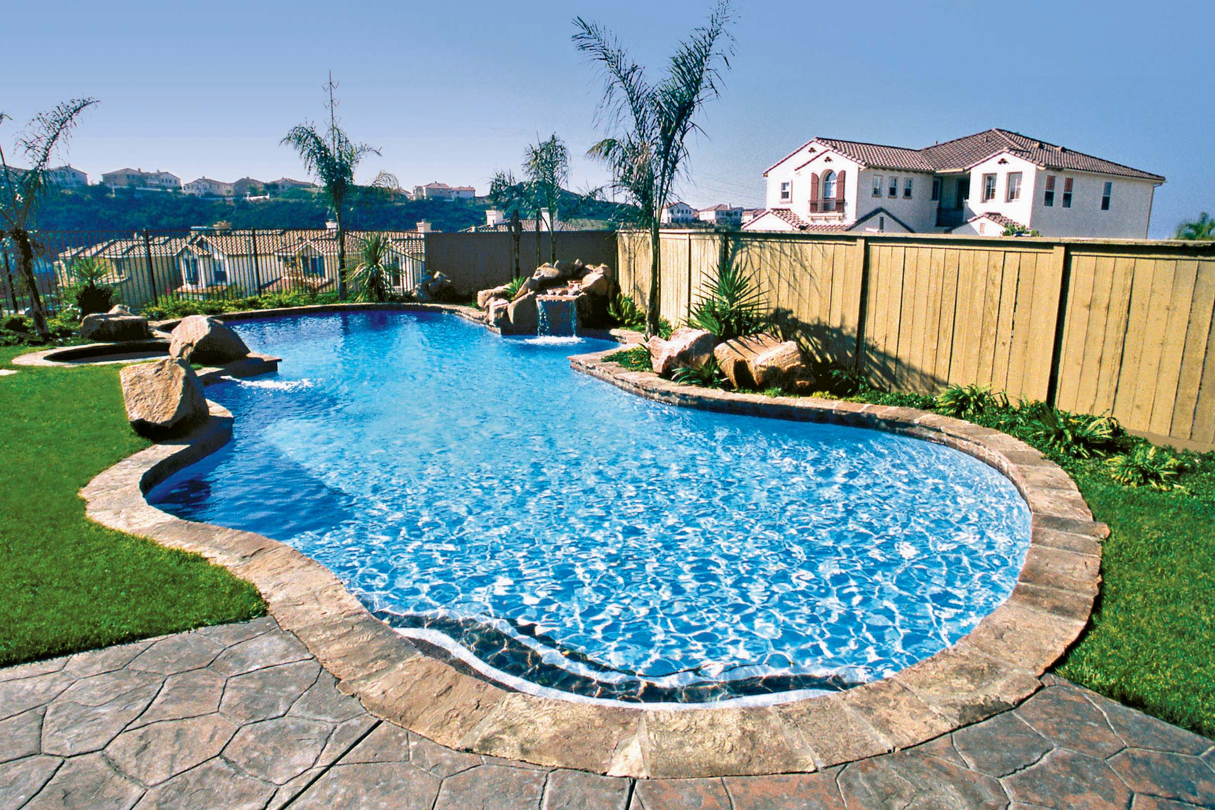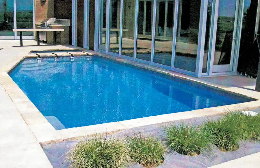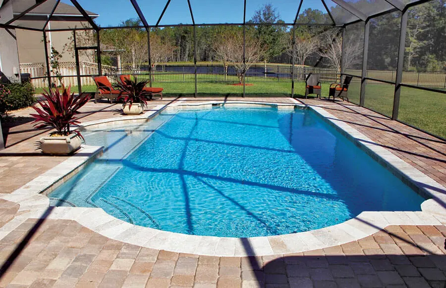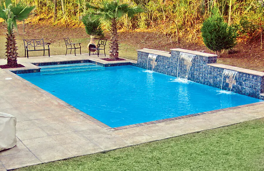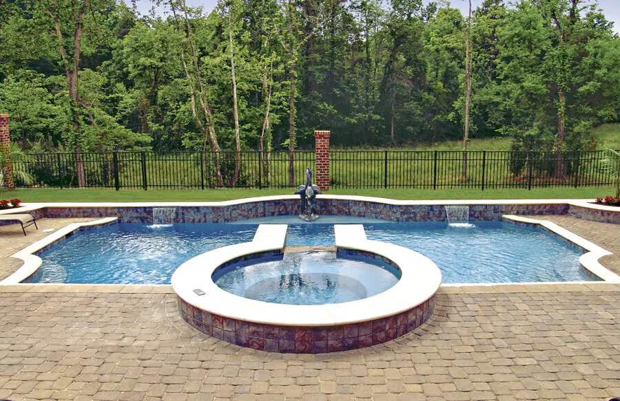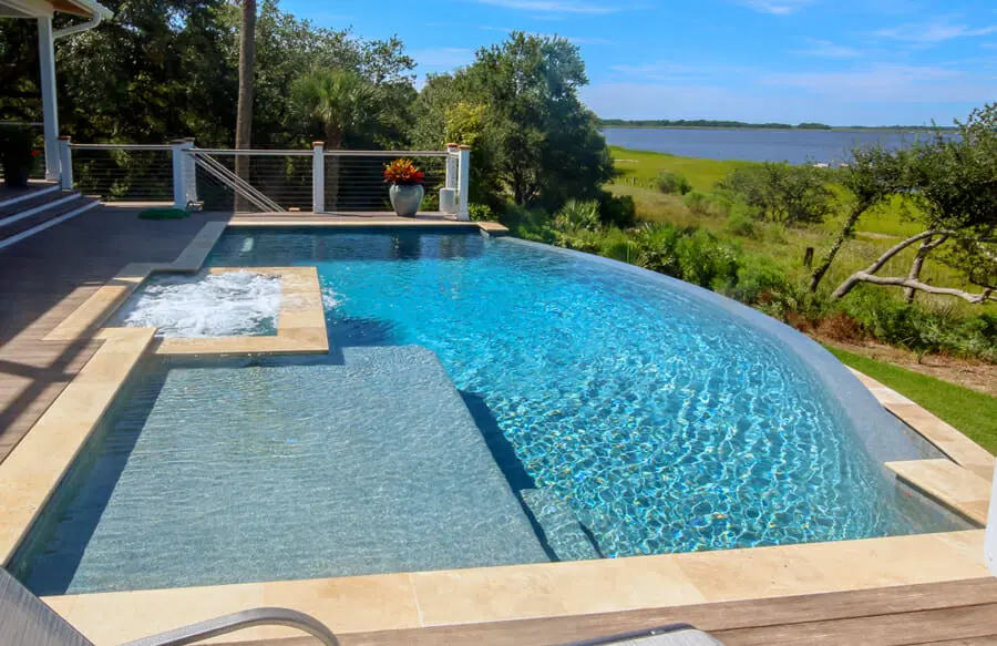 Curvy pool and spa wirh tanning shelf and sparkling teal water.