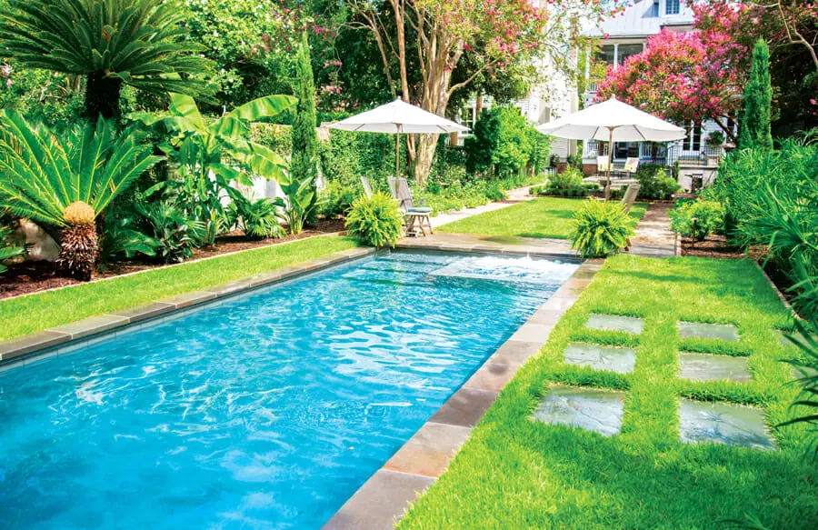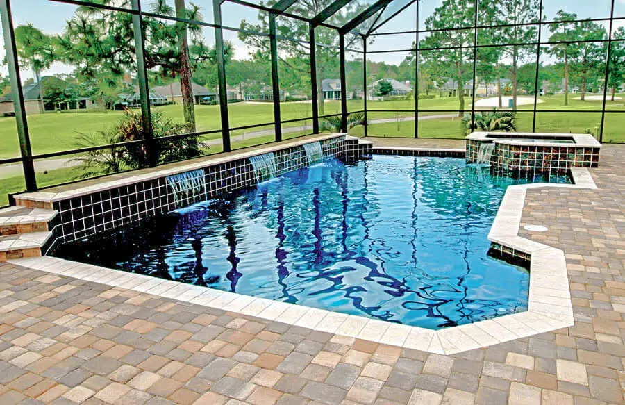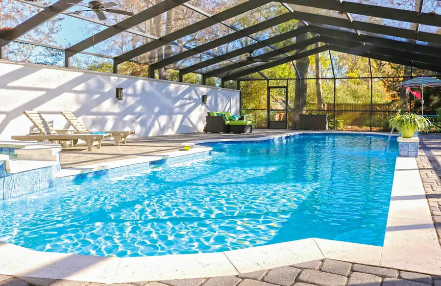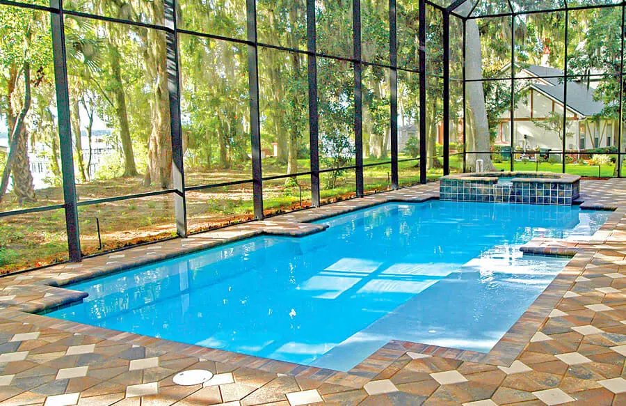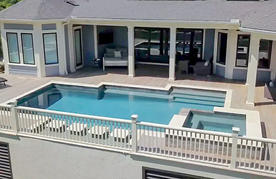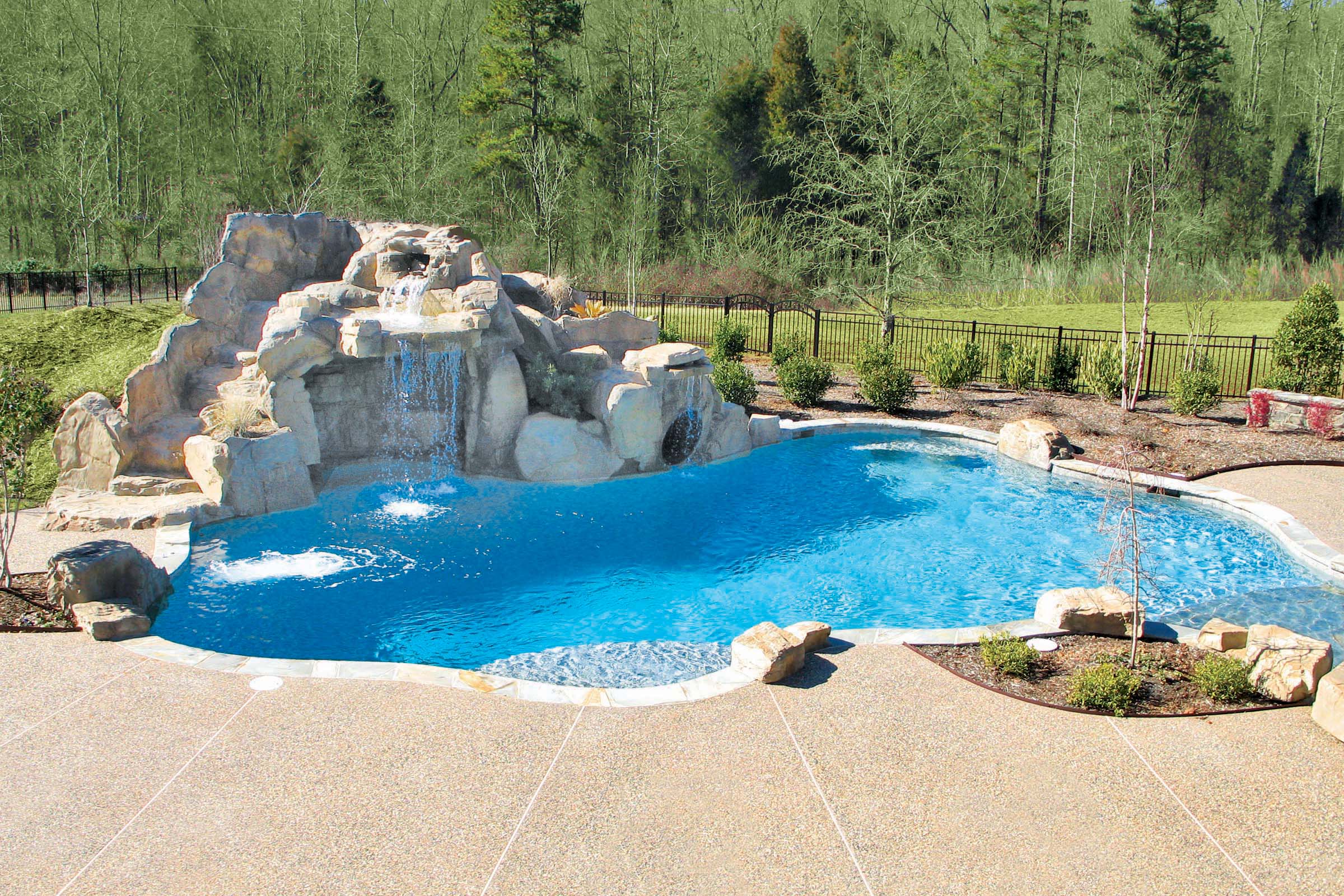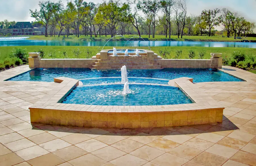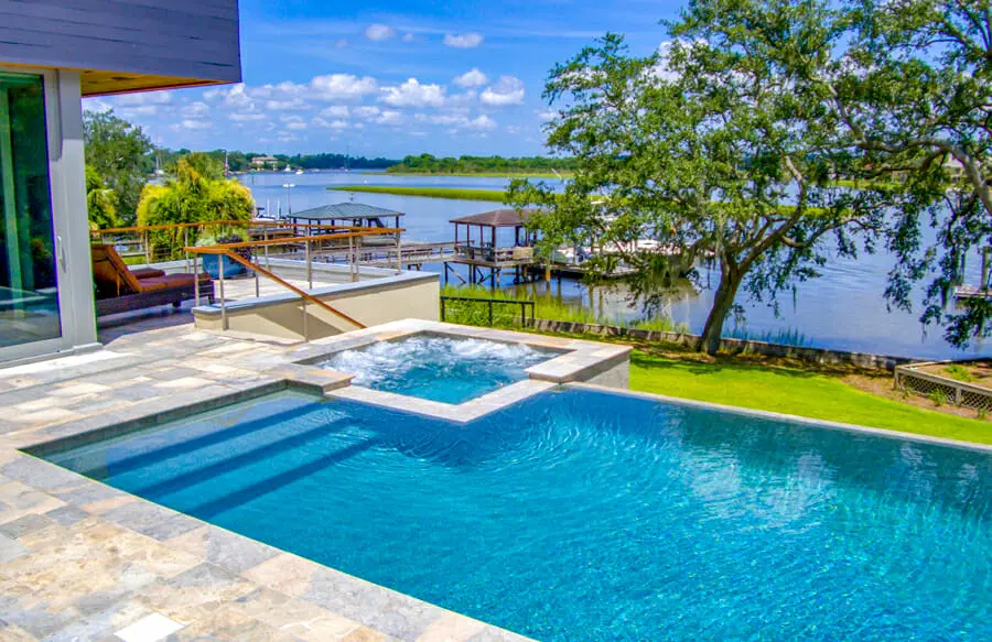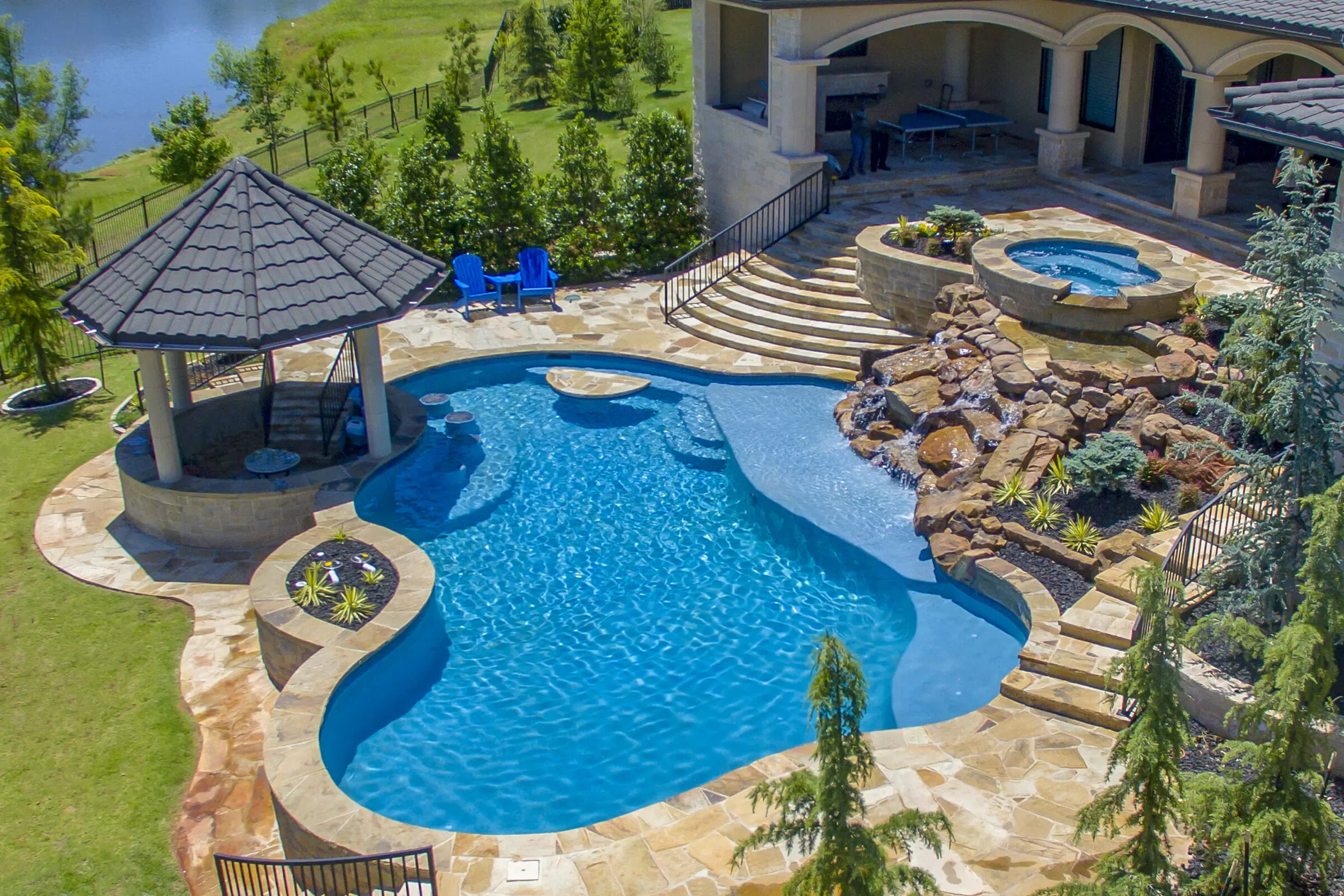 Curvy pool and spa wirh tanning shelf and sparkling teal water.