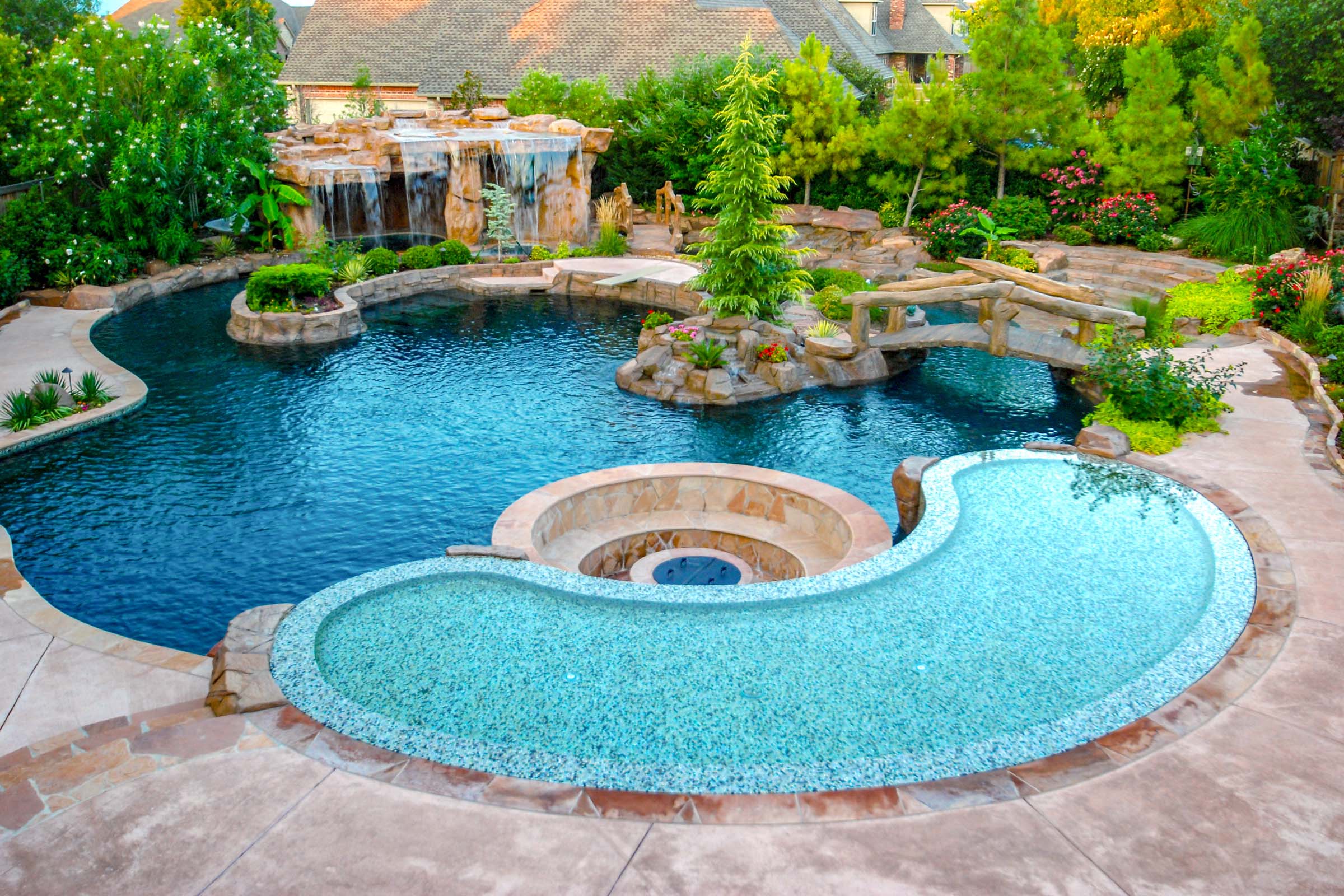 Curvy swimming pool with a round hydrotherapy spa in a backyard.