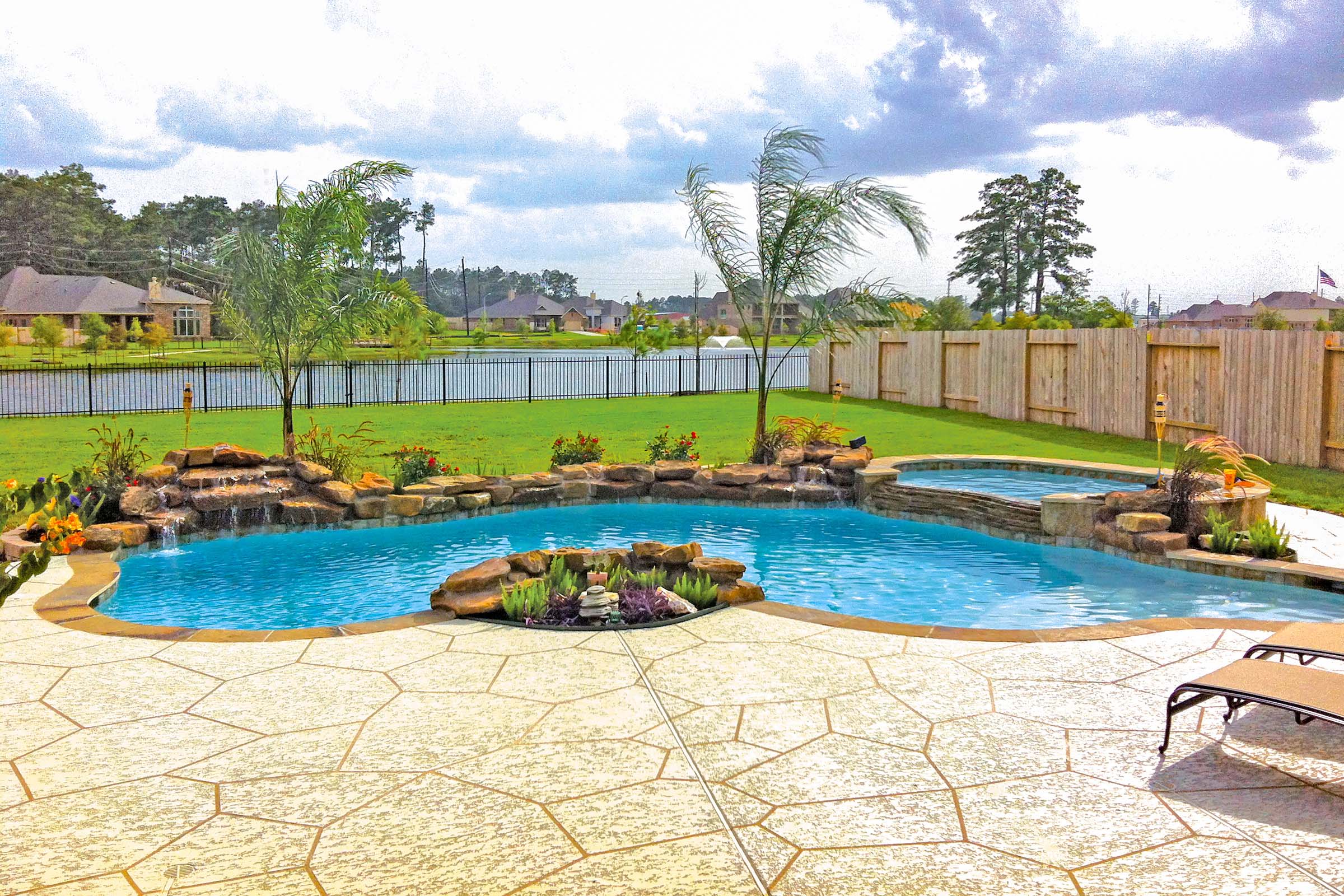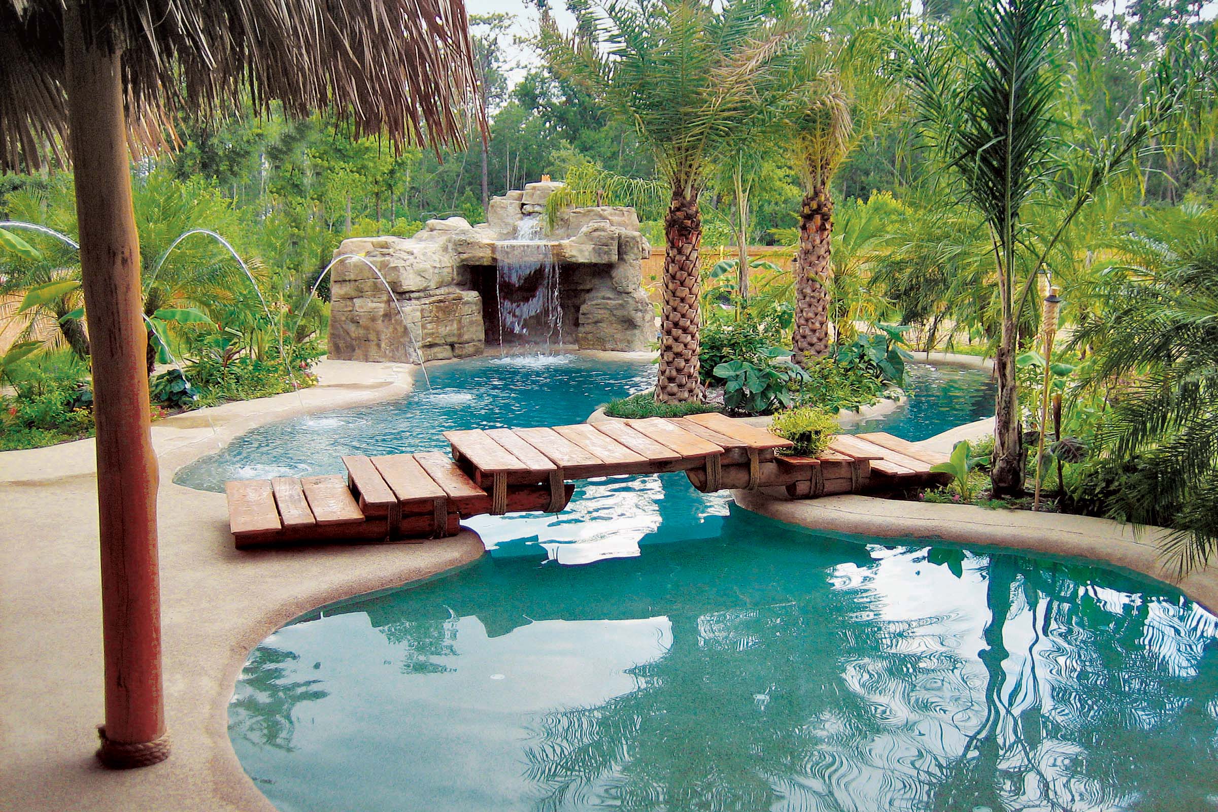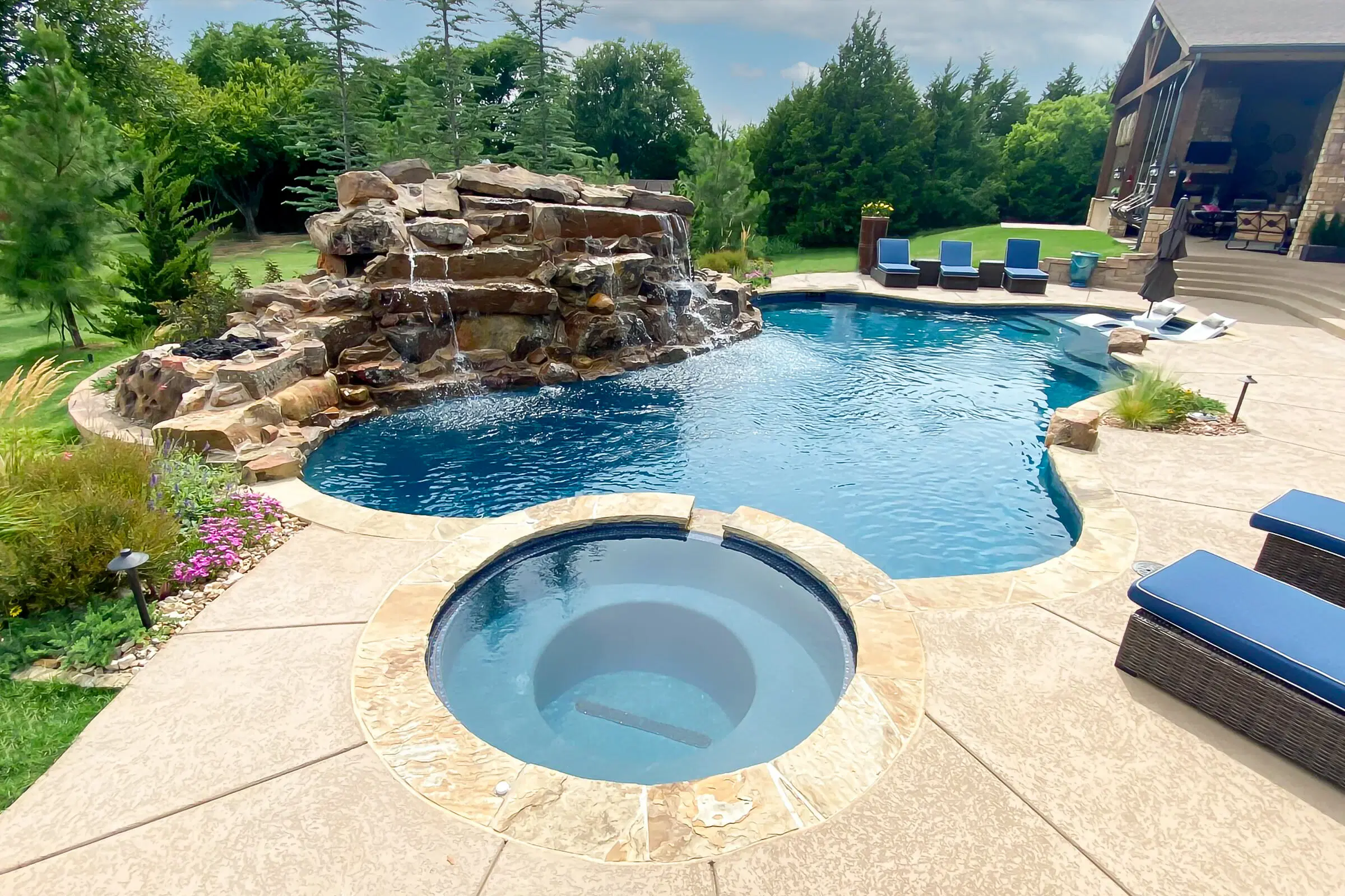 Pool and spa with flagstone exterior and rock waterfall with integrated pool slide.