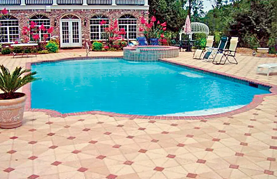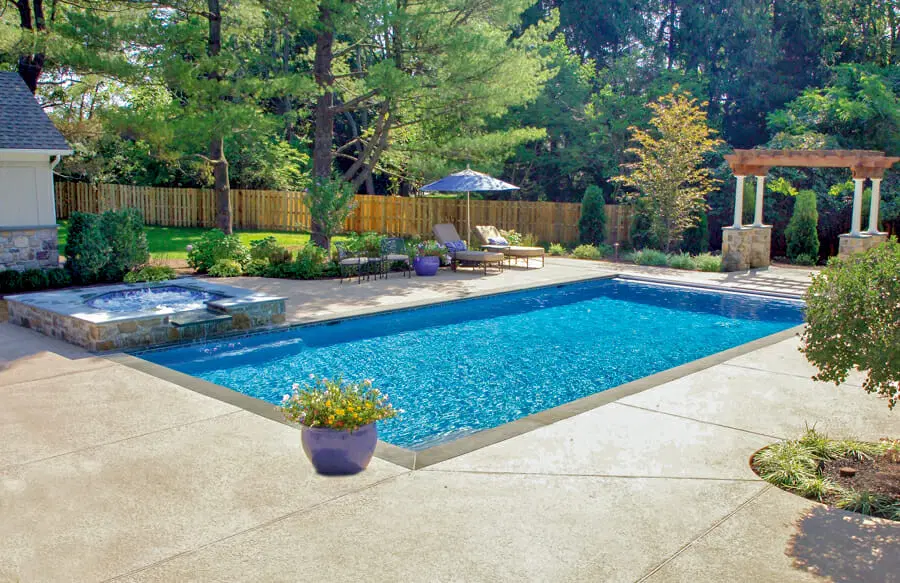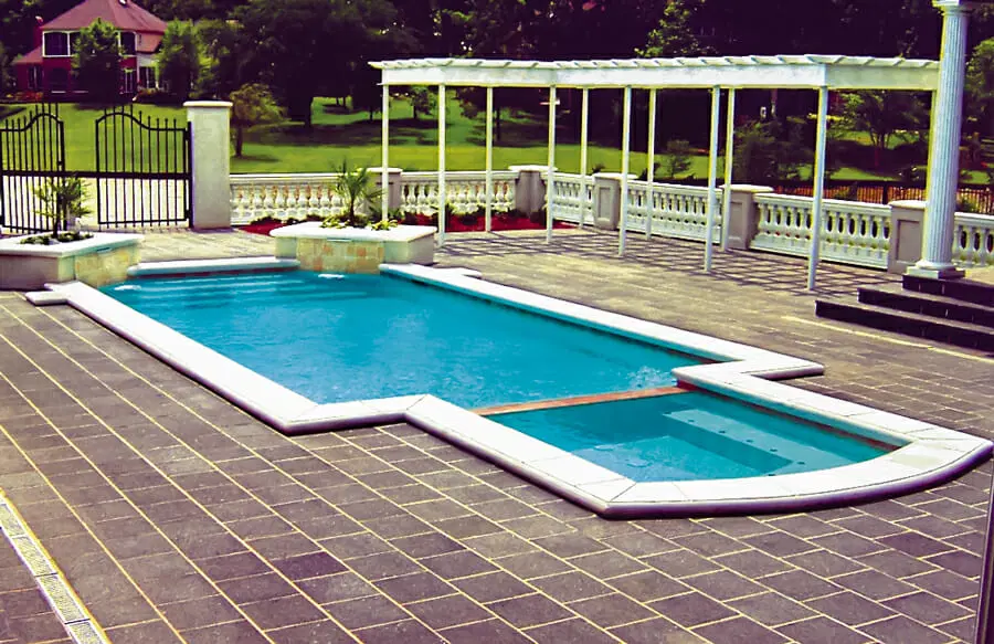 Inground pool with modified rectangular shape, square spa, and tanning ledge.