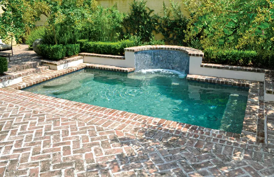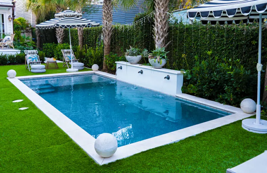 Sleek water feature installation with trio of metal spouts on a custom pool.