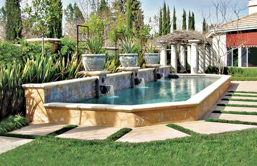Rectangular pool with raised wall and two decorative pots with water cascading onto pool surface.