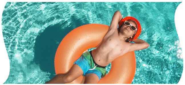 Free-form swimming pool with tanning ledge and colorful patio umbrella.